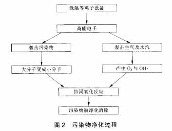 本工程主要采用電暈放電形式處理廢氣,在外加電場的作用下,電暈或者介質放電產生了大量攜能電子轟擊污染物分子,使其電離、解離和激發,然后便引發了一系列復雜的物理、化學反應,使復雜大分子污染物轉變為簡單小分子安全物質,或使有毒有害物質轉變成無毒無害或低毒低害的物質,從而使污染物得以降解去除。